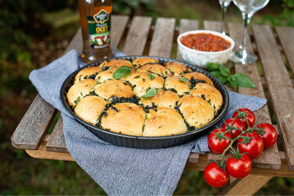 Až bochánky zavoní a zezlátnou, máme upečeno. Vyndáme je z trouby, potřeme zbylým bylinkovým máslem a podáváme s dipem.