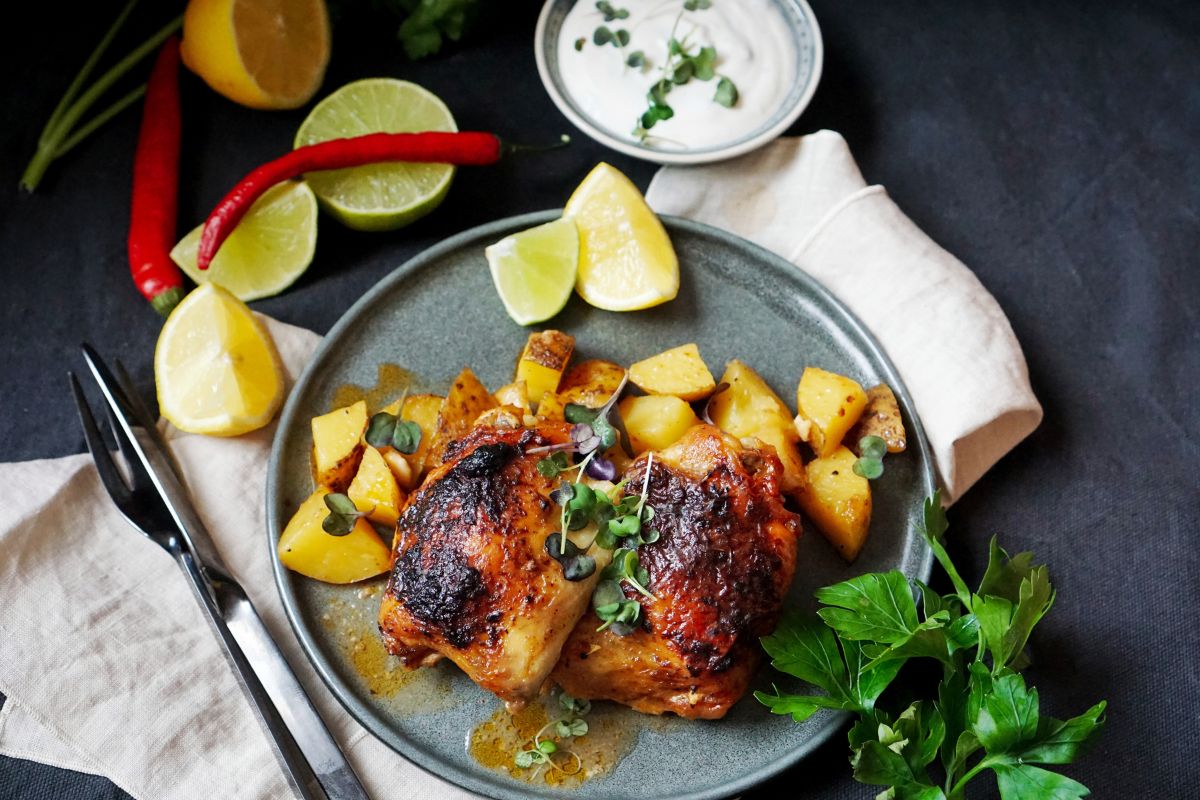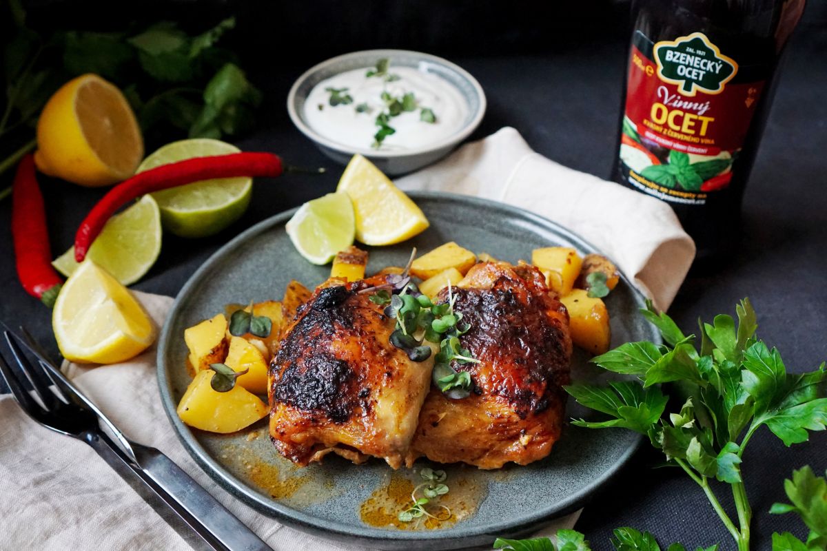 K tomuto pokrmu se skvěle hodí brambory v různých podobách – ať už jako kaše, šťouchané, pečené, nebo jednoduše připravené v jednom pekáči s masem. Vyzkoušejte brambory nakrájené na větší kousky (můžete nechat i slupku), rozprostřete je na dno pekáče, osolte, promíchejte a položte na ně marinované kuře. Vše se upeče společně, takže ušetříte čas i nádobí – a brambory zároveň nasáknou vůni marinády a získají skvělou chuť.