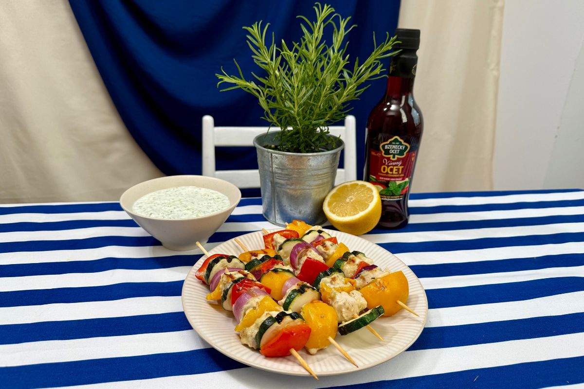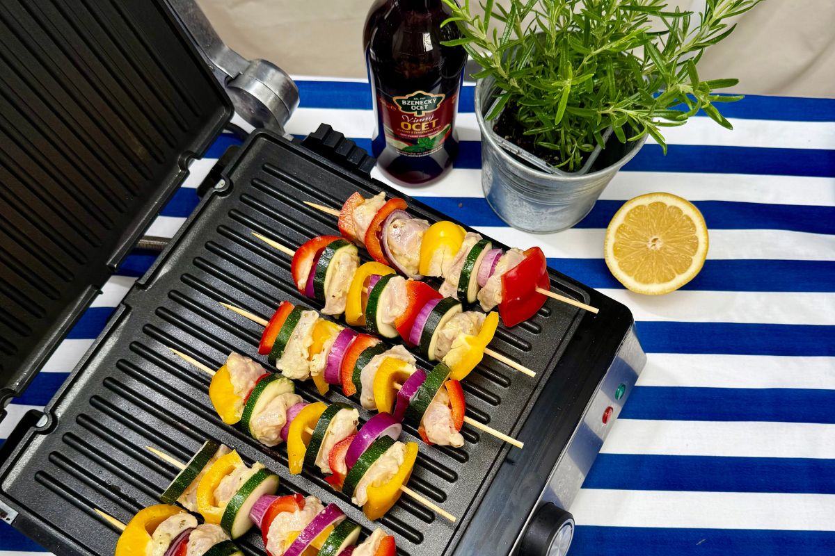 Kuřecí maso si naložíme do marinády, kterou připravíme smícháním olivového oleje, čerstvé citronové šťávy, červeného vinného Bzeneckého octa, dijonské hořčice, čerstvého česneku a sušeného oregana. Naložené maso necháme chvilku odpočívat a mezitím si nekrájíme zeleninu na špízy.