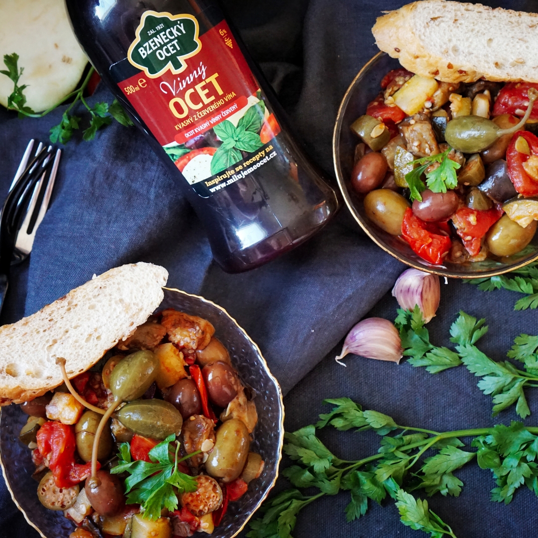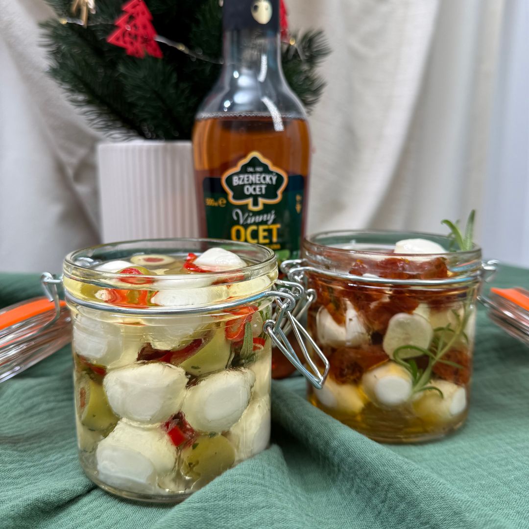 Nakládané mini mozzarelky s olivami, sušenými rajčaty a chilli